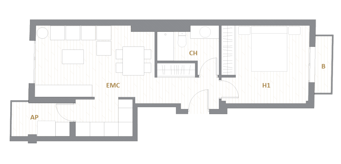 El salón y el dormitorio ponen énfasis en el espacio y la iluminación, asegurando una conexión fluida con el exterior y creando una atmósfera de armonía en cada rincón del apartamento.