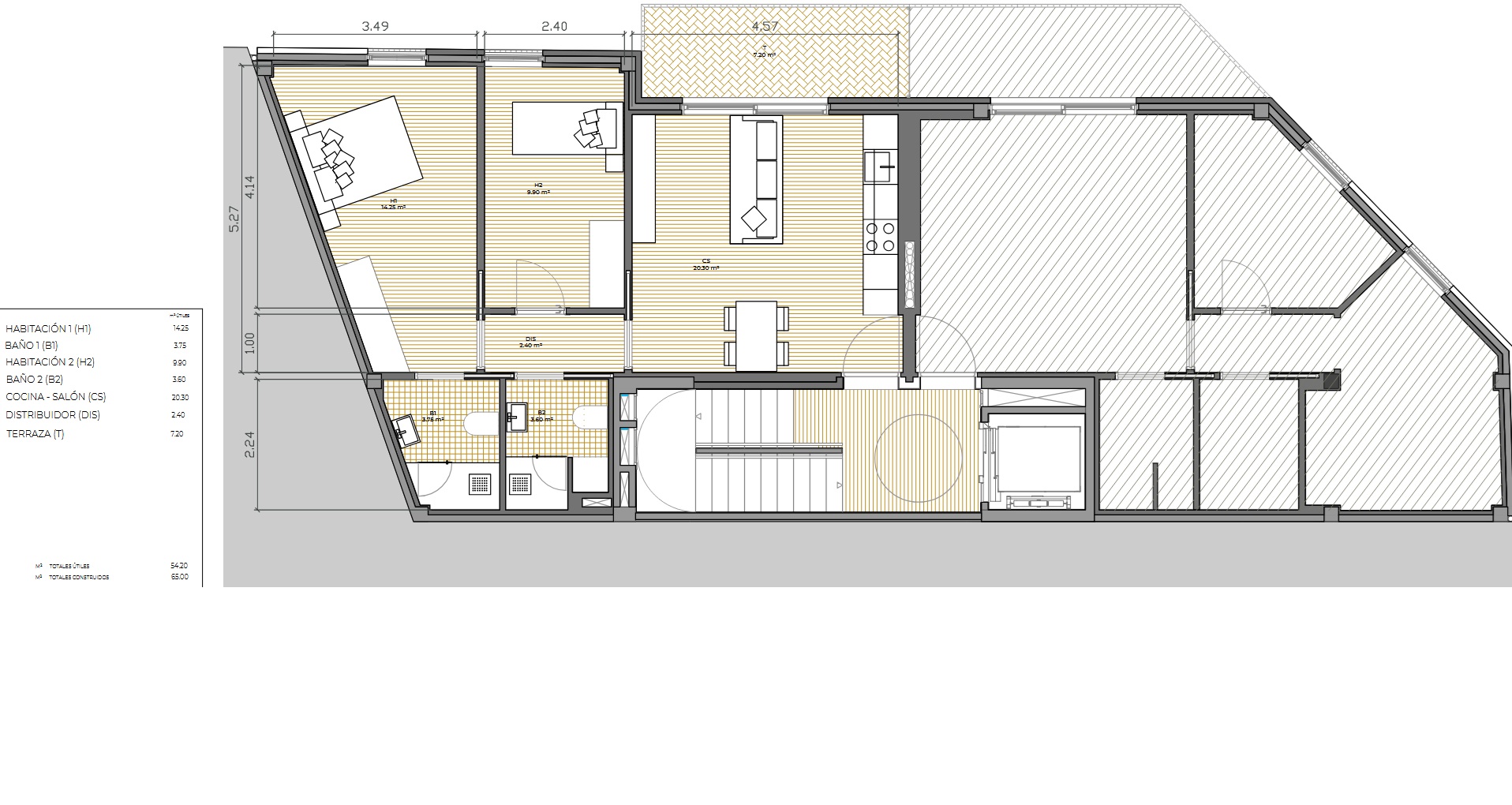 El diseño del apartamento consta de un área que incluye un espacio abierto y funcional con luz natural y una Terraza. Luego, pasando por el salón-comedor, pasamos a la zona donde se encuentran dos dormitorios, uno de los cuales tiene su propio baño y el otro un baño de invitados completo.